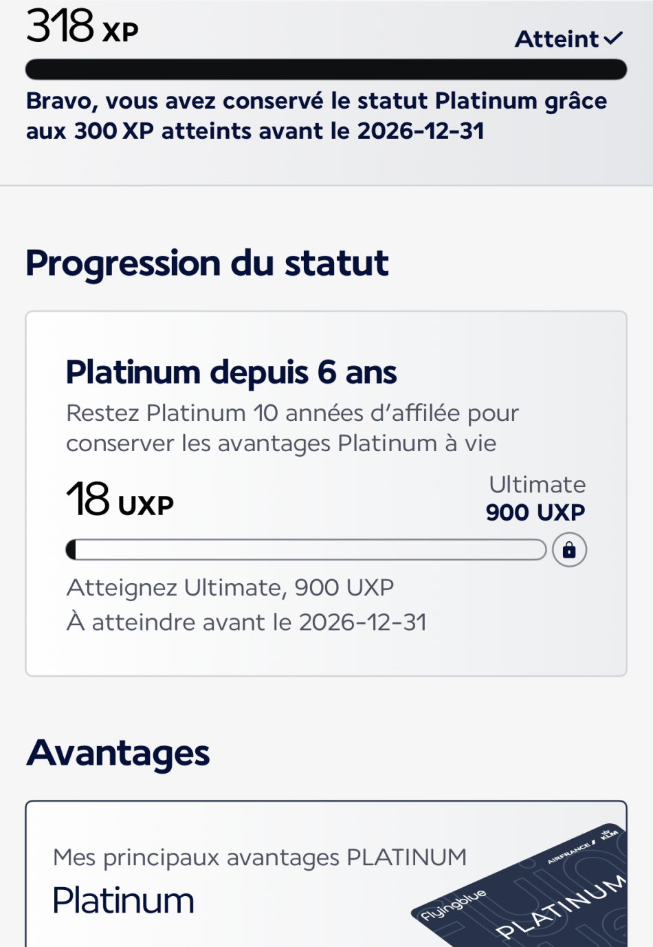アルティメットステータスを獲得するには900UXPが必要で、プラチナからの差が非常に大きく、しかもUXPはAF/KL便でのみ獲得可能で、達成が非常に困難です。