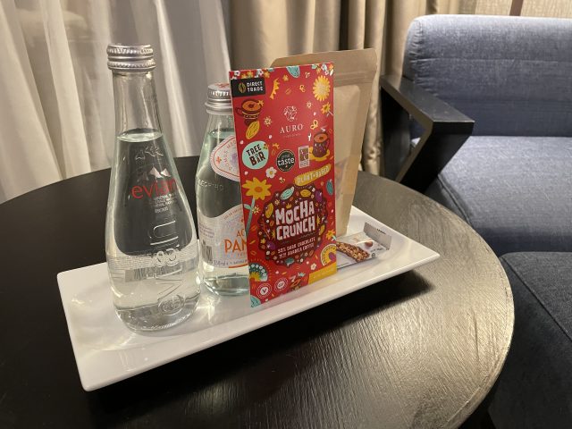 ウェルカムドリンクのミネラルウォーターとスナックが置いてありました。