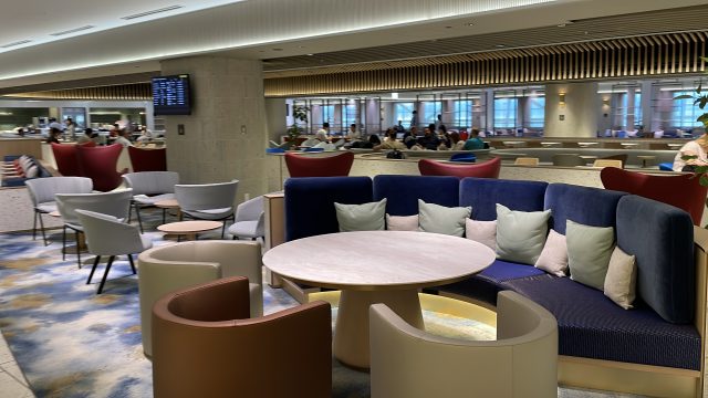 ラウンジ内には静かなワークスペース、カジュアルなソファ席、窓際の飛行機ビューシートなど、さまざまなスタイルの座席が配置されています。